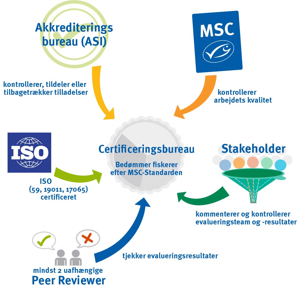 MSC er en non-profit miljøorganisation drevet af et ønske om at stoppe overfiskeri i verden. Vi tjener ikke penge på, at kommercielt fiskeri vælger at forsøge at blive certificeret i forhold til vores standard for bæredygtigt fiskeri. Fiskerne kontraherer et uafhængigt certificeringsbureau for at vurdere, om de kan leve op til MSC's standard. En sådan gennemgang tager mellem 8 måneder og 2 år.