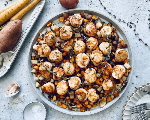 Pan Seared Sea Scallops with Roasted Root Vegetable Hash from culinary creator, Peter Som. This recipe is a warm hug served directly on your plate. The MSC certified sustainable scallops are buttery and bright while the root vegetables are hearty and comforting. The best part about this recipe is that, unlike a more traditional holiday turkey, you won't leave the dinner table feeling sleepy and lethargic.