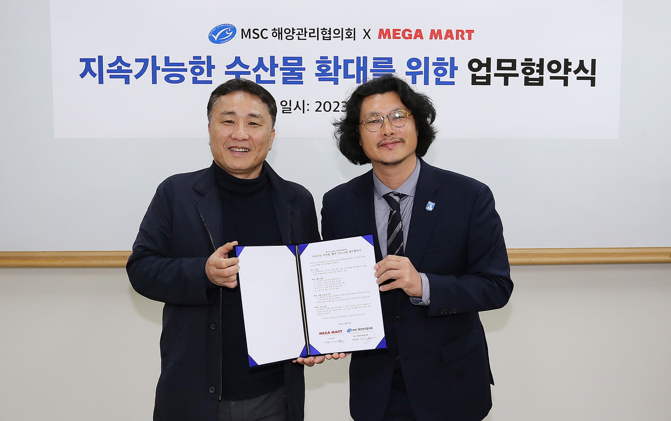 MSC와 메가마트는 27일 메가마트 부산 동래점에서 업무협약(MOU)를 맺고 MSC 에코라벨이 표기된 수산물 소비의 중요성을 알리기 위해 MSC 인증 수산제품을 활용한 온오프라인 홍보활동을 진행하기로 협의했다.