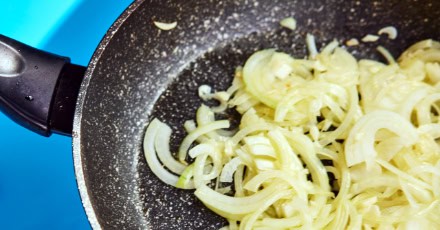 - Pokrój cebulę w półksiężyce i posiekaj czosnek. Wlej odrobinę oliwy do garnka i dodaj cebulę, czosnek oraz liść laurowy. Duś, aż cebula będzie miękka.