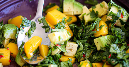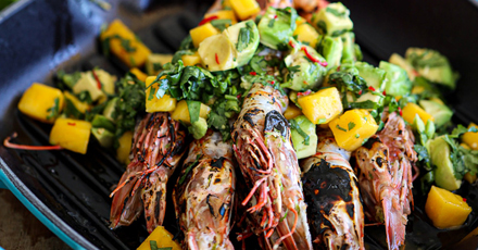 - While the prawns are marinating, make your salsa. Mix the mango, chilli, coriander, honey, lime juice, rind, salt, and pepper in a bowl.