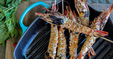 - Skewer each prawn lengthways down the spine towards the tail, then barbecue for 2 minutes on each side until golden.