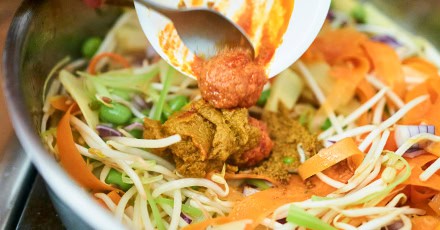 - Add the curry spices: Sprinkle the vegetables with curry powder, add the curry paste, and toss briefly to combine.