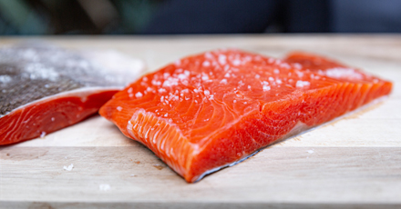 - Season the salmon: Season the MSC certified sustainable salmon fillets with salt and leave for a few minutes to draw the moisture from the skin.